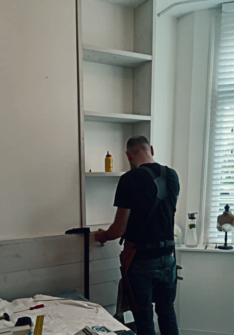 The first step was to visit the client at home and measure the available space for the bookcase. After making a first sketch I brainstormed with the client about the dimensions of the bookcase, the number of shelves, the distance between each shelf and the accessibility of the extra storage space below the bottom shelf. After this I finalized the plan and confirmed it with the client.