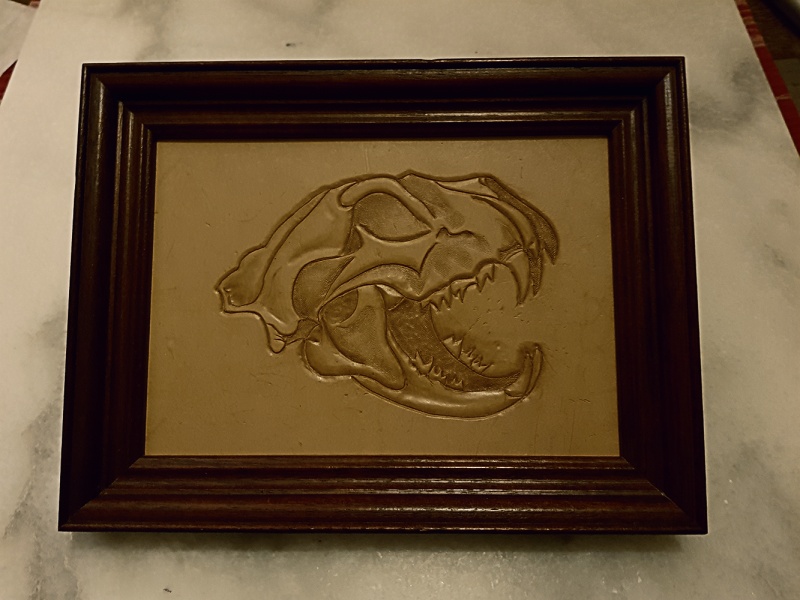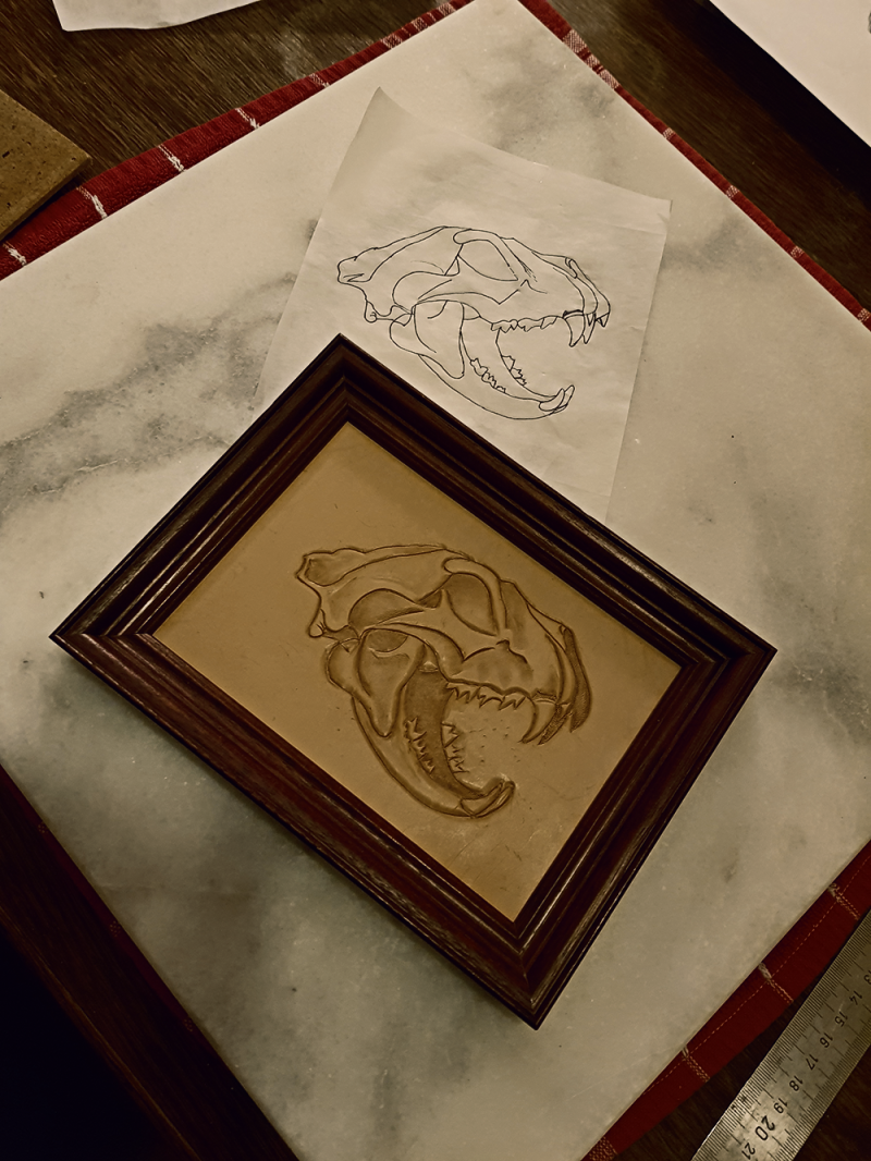 The end result is an A3 sized design of a lion skull on natural vegetable tanned leather. Meanwhile I practiced the techniques needed and learned a lot about how to create specific effects and add a certain level of detail.