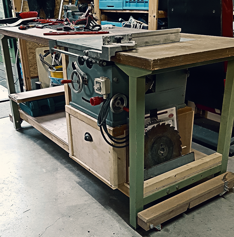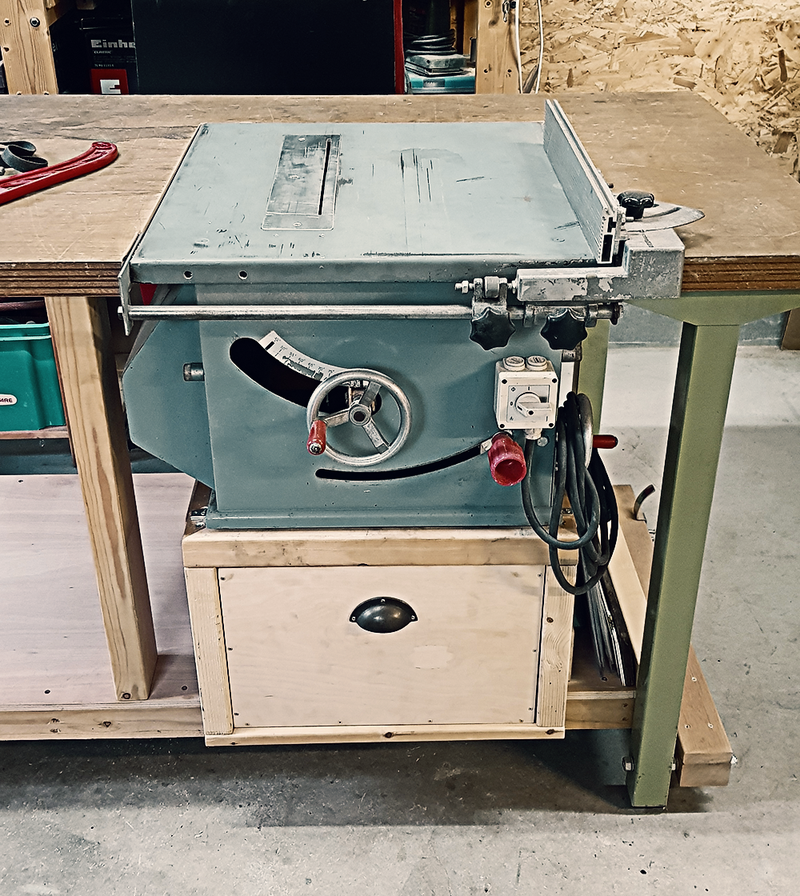 A table saw usually takes up a lot of floor space in a workshop, is big and heavy and can’t be moved around easily. It is also not a tool I would be using daily. So I was looking for a solution where it would not stand in my way and that allowed me to move it around easily.