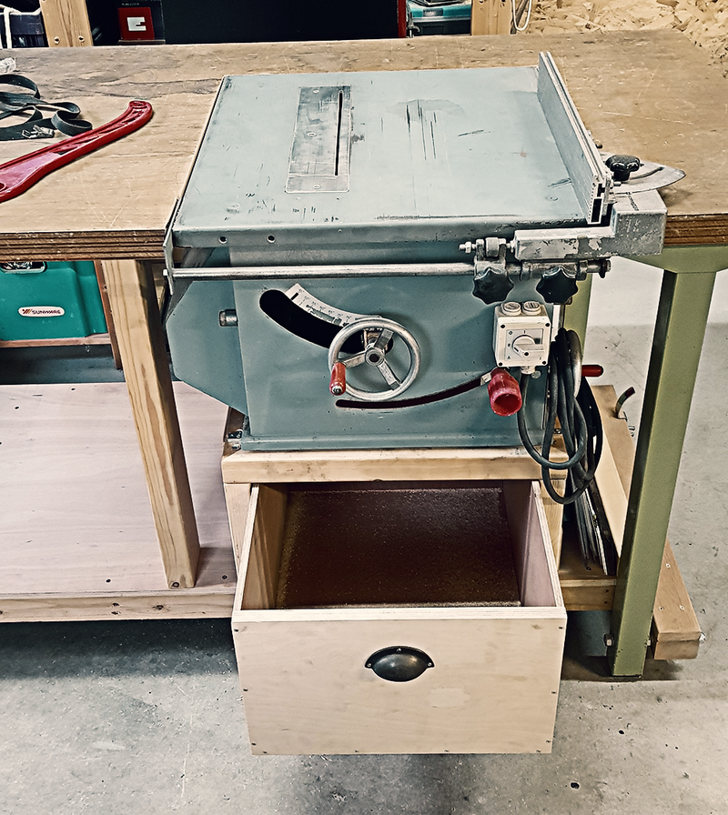 Next I built the wooden frame the table saw would stand on and added wooden panels on the outside. Within the wooden frame I built a drawer that catches much of the sawdust and off-cuts and mounted a nice old cast iron handle on the front.