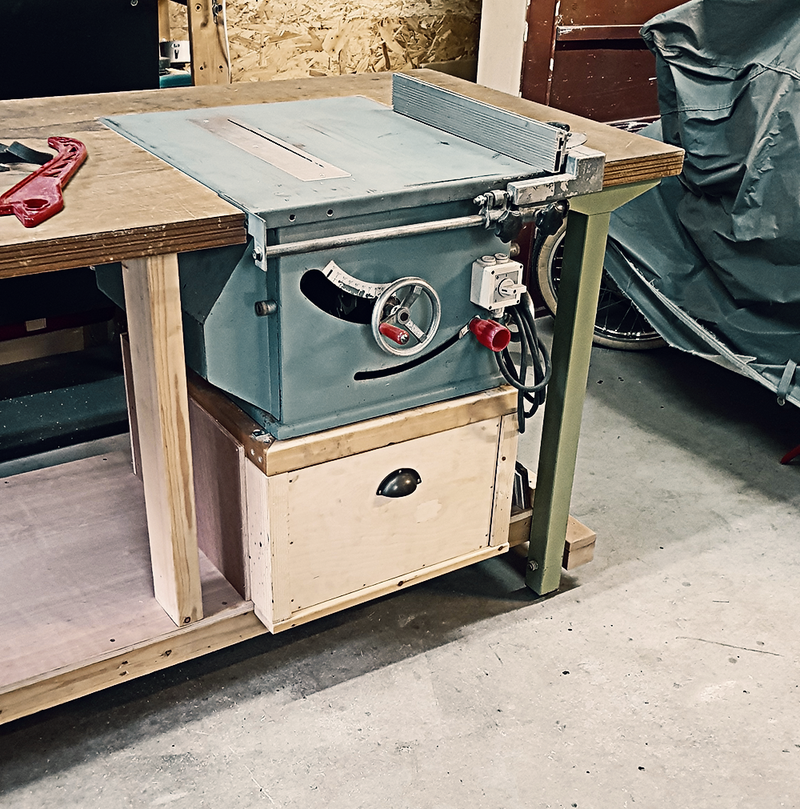 My solution was to build the table saw into the workbench. This meant the table saw didn’t occupy limited floor space and I would be able to move the table saw around by lifting, turning and moving around the workbench.